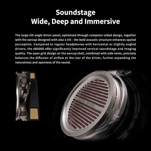 [Soundstage: Wide, Deep and Immersive] The large-tilt-angle driver panel and the earcup designed with also a tilt – the special acoustic structure enhances spatial perception. Compared to regular headphones with horizontal or slightly angled drivers, the AR5000 offer significantly improved vertical soundstage and imaging. The open grid design on the earcup shell with side vents precisely balances the diffusion of airflow at the rear, further expanding the naturalness and openness of the sound