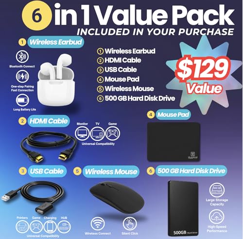 【HubxcelAccessory】Bundle includes Rechargeable Wireless Earbus, HDMI Cable, USB Cable, Mouse Pad, Wireless Mouse, and 500GB portable External drive for your daily work and life. Free Microsoft Office Professional Plus with lifetime license (including Word, Excel, OneNote, Outlook, PowerPoint, Access).